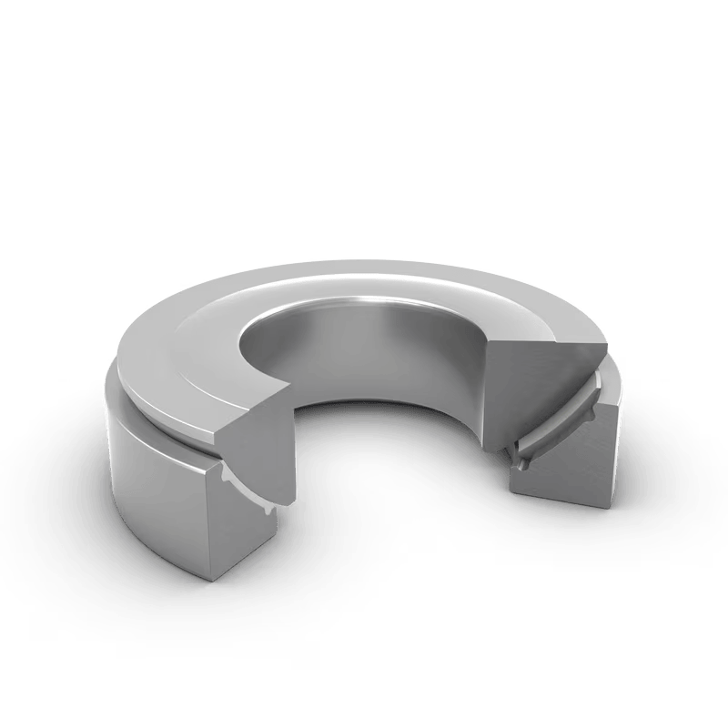 Конструкция упорного сферического подшипника стандартной комбинации включает выпуклое внутреннее кольцо сферической формы и внешнее сферически вогнутое кольцо. Стальные кольца подшипника разборные и могут устанавливаться по отдельности для более простого монтажа. Скользящая поверхность механизма оснащена антифрикционным материалом, изготовленным из армированного волокном полиамида (ПТФЭ FRP). Подшипник смазывается на заводе и, благодаря антифрикционному материалу, не требует технического обслуживания. Упорный механизм может смазываться повторно для увеличения срока эксплуатации подшипника.