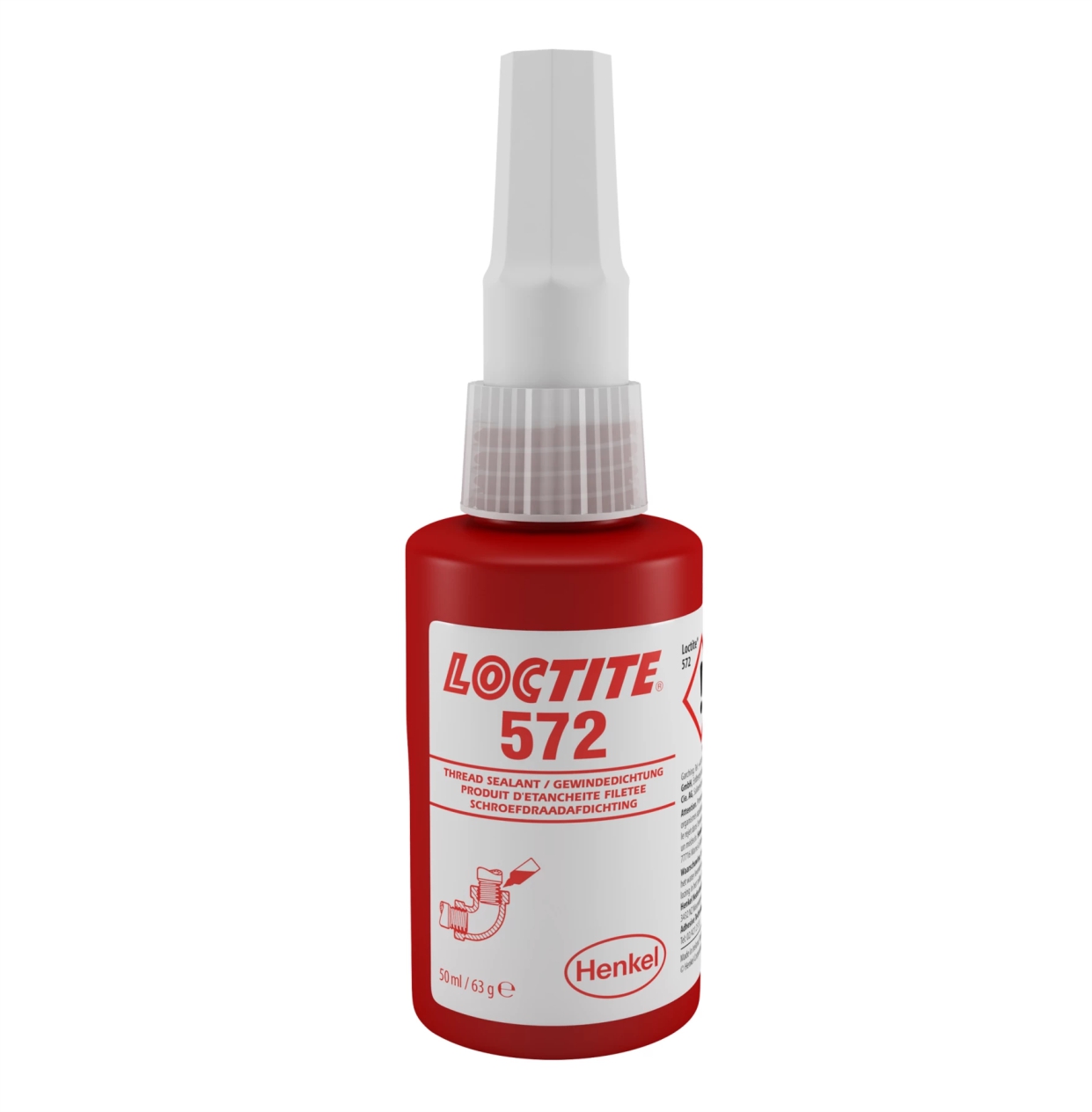 LOCTITE® 572 - резьбовой герметик на метакрилатной основе, от белого до серо-белого цвета, средней прочности, для металлических труб и фитингов. Подходит для крупных резьб, его момент срыва составляет 7 Нм.